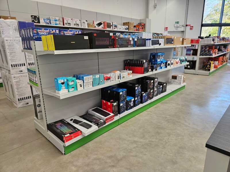 L’esposizione è stata concepita con gondole dogate perfettamente integrate tra loro, che creano delle linee orizzontali e verticali molto armoniche, e che offrono la massima flessibilità espositiva. Sopra le gondole, abbiamo installato scaffalature dedicate all’esposizione di prodotti informatici più piccoli (accessori, periferiche, smartphone in vetrina) garantendo visibilità ottimale e ordine.